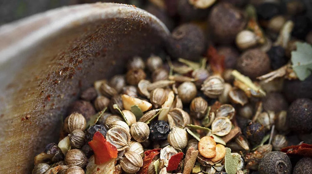Ground Coriander, Ground Ginger, Ground Cinnamon, Ground Cumin, Ground Black Pepper, Ground Pimento, Ground Cardamom, Ground Clove, Ground Bay, Ground Cassia, Ground Nutmeg.